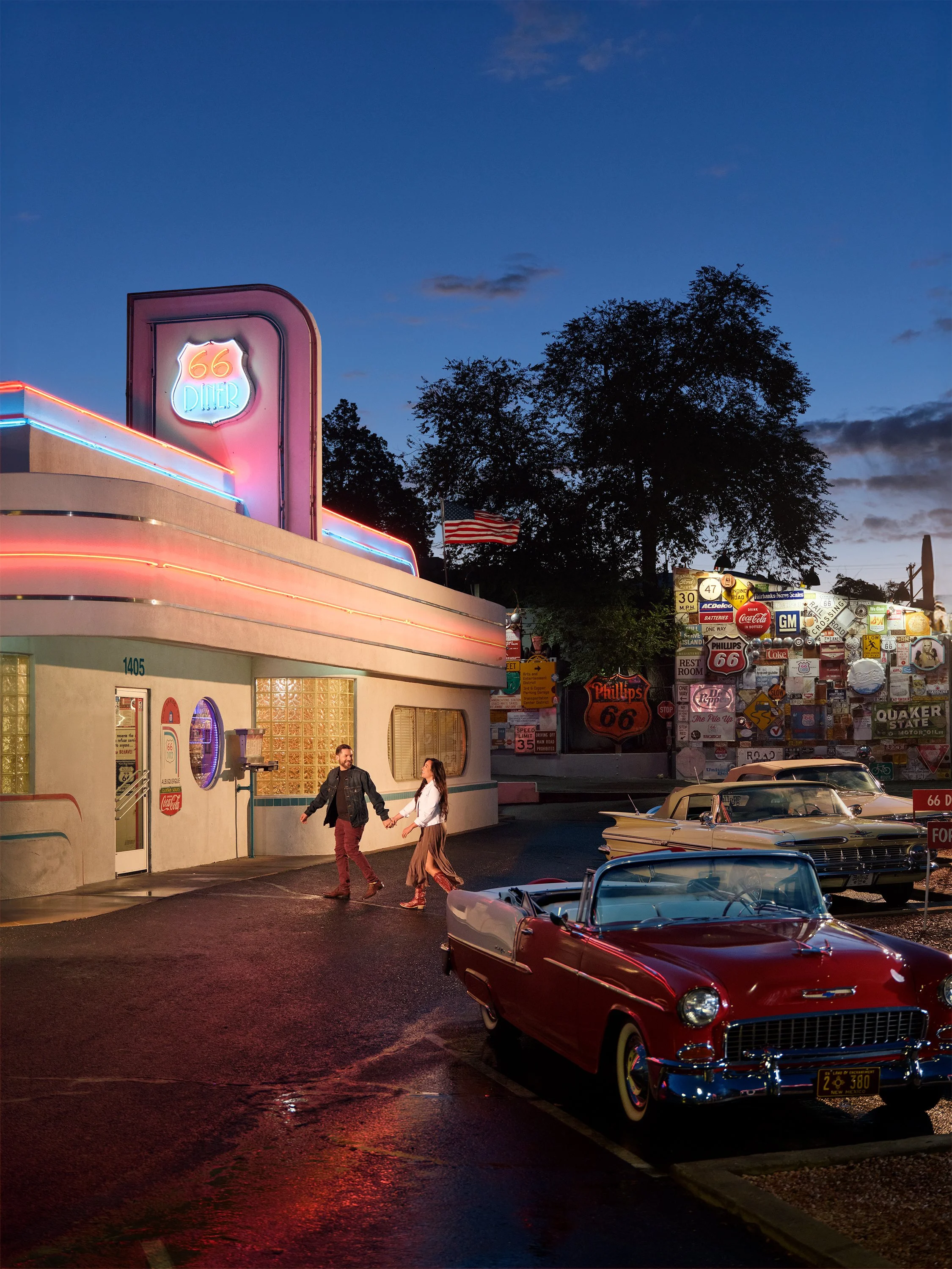 In late 2025, I was contacted by Visit Albuquerque to brainstorm ideas for the cover of their 2026 Visitors Guide. The goal and overall theme of the project was to highlight The 100th anniversary of the route 66. We wanted to create an image that embodied the city’s connection to Route 66 in an authentic, contemporary way. After exploring several concepts, we settled on the iconic Route 66 Diner near downtown — a location that carries both visual recognition and cultural weight.